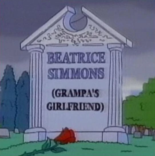 Beatrice Simmons (12 de agosto de 1930-24 de marzo de 1991) fue un personaje menor de la serie Los Simpson. Tuvo su primera aparición en el episodio de la temporada 2 "Old Money". Fue la novia de Abraham Simpson, aunque luego falleció y le dejó su fortuna. Papel en Los Simpson[]El Abuelo conoce a Beatrice en el Castillo de Retiro de Springfield debido a que el personal se equivocó accidentalmente intercambiando los medicamentos de ambos. Pronto se enamoraron y comenzaron a salir. Muerte[]Abraham arregla otra cita con Bea, pero Homer hecha todo a perder cuando obliga al Abuelo a ir con la familia a un safari de leones. En el safari, se quedan atrapados y cuando Abe logra volver al asilo, Jasper le cuenta que Bea había muerto de una explosión del ventrículo, literalmente: del corazón roto. Luego de su muerte[] Tumba de Bea en "Alone Again, Natura-Diddily". La misma noche en la que murió, Abe encuentra una carta que decía que Bea le dejaba toda su gran herencia. Para hacer feliz a la gente, el Abuelo comienza a interrogar a varios habitantes de la ciudad en que gastarían el dinero, y Lisa le recomienda en ayudar a los pobres. Tratando de divertirse con el dinero, el Abuelo ve al fantasma de Bea en una montaña rusa. Este le dice que gaste el dinero en personas que no podrían. Aparte de esto, el fantasma afirma que también asusta a una familia en Texas. Abraham visita varios lugares de Springfield y se da cuenta de que no puede ayudar a todos. Para poder ganar mas dinero, decide apostar, aunque Homer logra frenarlo antes de que gaste todo. Abe ignora a Homer y se fija en los ancianos del Asilo. El Abuelo gasta el dinero mejorando el Asilo y creando un comedor llamado "Beatrice Simmons Memorial Dining Hall". (Comedor en memoria de Beatrice Simmons traducido al español). Curiosidades[]