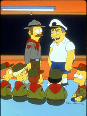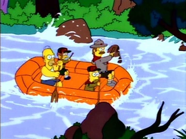 Boy-Scoutz N the Hood (Explorador de incógnito en España y Exploradores a fuerza en Hispanoamérica) es el octavo episodio de la temporada 5 Los Simpson. Sinopsis[]Todo comienza cuando Bart y Milhouse, jugando a los videojuegos, son obligados a irse del lugar al quedarse sin dinero. Mientras tanto, Homer tira su último cacahuete debajo del sillón y, cuando trata de buscarlo, encuentra un billete de 20 dólares. Sin embargo, cuando comienza a caminar para gastar su dinero, tropieza con el cacahuete, y el billete vuela a través de la ventana abierta. Bart y Milhouse encuentran el billete, el cual usan para comprar un super Squishees que estuviera hecho unicamente de sirópe. Después de haber tenido alucinaciones, ambos hacen una cruzada alrededor de Springfield, estando en un estado psicodélico por el azúcar. A la mañana siguiente, Bart no recuerda nada de lo ocurrido el día anterior, por lo que se sorprende cuando se da cuenta de que se ha unido a los niños exploradores. Ese mismo día, Bart lleva su uniforme a la escuela para devolverlo, pero luego descubre que los niños exploradores se salvaban de hacer el examen de matemáticas. Aunque la primera reunión de exploradores le desagrada, principalmente luego de ver que Flanders es el líder de tropa, luego ve que los niños recibían navajas de bolsillo por ser scouts. Por esta razón, decide ser un niño explorador, llegando a gustarle al grado de saludar a Flanders con el mismo entusiasmo que él. Un día, los exploradores realizaban un viaje de padres e hijos, así que Bart se ve obligado a llevar a Homer, ya previendo que haría tonterías que lo pusieran en ridículo. A éste no le gusta demasiado, y aún menos cuando ve que debía compartir su balsa con Ned Flanders. Accidentalmente, en el río, el pequeño grupo de Bart, Homer, Ned, Rod y Todd Flanders toma el camino equivocado y quedan perdidos en el mar. Sin tener otra cosa que hacer, deciden esperar a ser rescatados, aún cuando no tenían ni comida ni agua. Cuando todo parecía perdido y creían que iban a morir, Homer comienza a sentir un aroma a hamburguesas, y luego descubre un puesto de Krusty Burger en una plataforma petrolera en medio del mar. Mientras tanto, los otros niños exploradores habían tomado el camino correcto, pero, de todas formas, terminan peor que Homer: cuando estaban en medio del bosque haciendo una fogata, son atacados por un oso, contra el cual Ernest Borgnine, quien lideraba el grupo, no podía luchar ya que Homer le había robado su navaja de bolsillo para dársela a Bart como regalo. Al final se salvan viendo una torre petrolera que había sido comprada por Krusty el payaso para convertirlo en hamburguesería, que al final Los Simpson y Los Flanders comen ahí. Mientras tanto Ernest Borgnine y el resto del equipo de scouts llegan a un campamento abandonado, donde empiezan a cantar alegremente alrededor de una fogata, mientras son observados y posteriormente atacados por una figura en las sombras. Enlaces externos[]