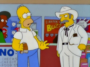 E-I-E-I-(Annoyed Grunt) o E-I-E-I-D'oh (EIEI (Gesto de disgusto) en España y Homero el granjero en Hispanoamérica) es el quinto episodio de la temporada 11 de Los Simpson. SinopsisLa familia está viendo una película, The Poke of Zorro (parodia de La Máscara del Zorro). A la salida, Snake empuja a Marge, por lo que Homer le da una abofetada con un guante y reta a Snake empleando la frase extraída de la película "Exijo una satisfacción""Lo reto a un duelo". Éste busca su pistola, pero al no encontrarla, huye como un cobarde. Más tarde en la taberna de Moe, Moe insulta a Homer, este abofetea a Moe con el guante,retándole a un duelo. Para tranquilizar a Homer, Moe le da una cerveza gratis. Viendo los resultados obtenidos, Homer decide aprovecharse de la situación. Pero en el Kwik-E-Mart, al dar guantazos para saltarse la cola, un sureño al que le gusta los duelos, lo acepta, y el duelo sería al amanecer. Al amanecer, Homer se despierta y cree que es una pesadilla, hasta que ve la caravana del sureño aparcada en su casa. Entonces la familia huye engañando al sureño. Tras buscar varios sitios donde refugiarse, hasta que encuentran la granja en la que se crío Homer. Deciden cultivar en la tierra, pero es demasiado alcalina. Así que Homer llama a Lenny para que le envíe plutonio. Cuando lo recibe, fumiga la tierra con él. Al día siguiente, la familia sale a ver los supuestamente gigantescas plantas, pero no hay plantas. Homer decide quitarse la vida, pero Lisa le dice que no lo haga porque hay brotes. Cuando ya han crecido esas plantas, con aspecto de tomatera, Bart le da un mordisco a un tomate, pero por dentro es como tabaco. Homer llama a esta adictiva planta tomacco (tan adictiva para las vacas, hasta adictiva para Bart) que vende exitosamente. Entonces llega una limusina de la empresa tabacalera "Laramie". Estos le piden la planta, a cambio de 150 millones de dólares. Los Simpson lo discuten, y deciden que deberían darle la planta a cambio de 150 mil millones de dólares. Esta oferta es rechazada, y dejan a la familia tirada enfrente de la granja, sin embargo hay problemas cuando los animales adictivos se están comiendo todo el Tomacco. Homer consigue salvar una planta. Se refugian en la casa, allí Lisa discute con Homer, diciendole que queme la planta, pero este no le hace caso, despues la casa es allanada por los adictivos animales. Homer tira la planta, que cae en las manos de una gerente de la tabacalera (esta se llama Mindy). Esta se sube a un helicóptero, despues el piloto dice que hay exceso de peso, despues todos los gerentes ven al gerente obeso, este le contesta que no come azúcar, luego se muestra una oveja adictiva al tomacco en el helicóptero, que causa que el helicóptero se estrelle contra una montaña, matando al piloto y a todos los gerentes. La familia vuelve a su casa de Springfield, donde sigue estando el sureño. Cuando comienza el duelo, el sureño huele un pastel de fruta que había hecho Marge. Homer le dice que no se olvide del duelo. El sureño le dispara. La bala alcanza su hombro. Lisa le dice a su padre que debería ir al hospital, pero Homer decide que después de comer pastel. |