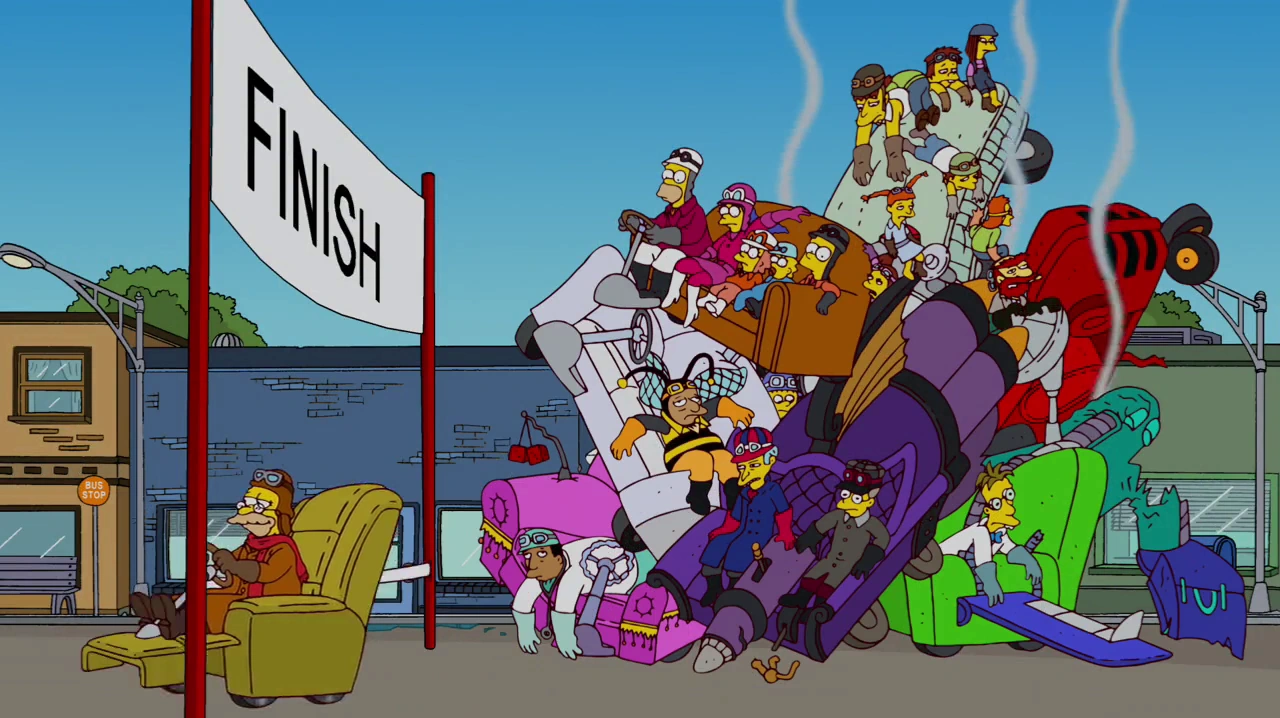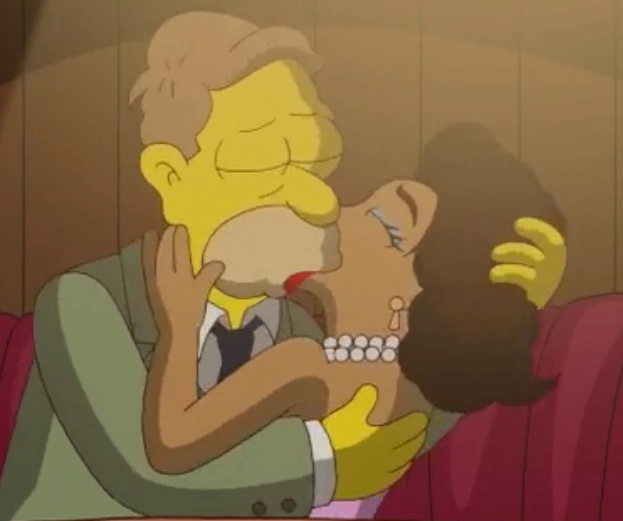 Gone Abie Gone (Adiós, Abie, adiós España y ¿Dónde estás, abuelo? en Hispanoamérica) es el tercer episodio de la temporada 24 de Los Simpson. Sinopsis[]Homer y el abuelo[]Homer va a Gulp 'N' Blow por aros de cebolla. Sin embargo, debido al estrés de una camarera, un hombre que se queja de un vagabundo que había terminado de ducharse en el lavabo del baño y el equipo de artes marciales de Milhouse, el cajero accidentalmente arroja aros de cebolla calientes a la cara de Homer. Homer demanda a Gulp 'N' Blow y obtiene derecho a recibir 5.000 dólares debido a los honorarios legales y lo convencen de poner el dinero en un fondo universitario para Lisa en un sitio de póquer. Marge luego recuerda y le recuerda a Homer que se suponía que visitarían al abuelo el día del juicio. Homer y Marge van a la residencia de jubilados y descubren que el abuelo ha desaparecido. Buscan las pertenencias del abuelo para ver si les ayudarán, y Marge encuentra una nota que dice "Spiro's. El lugar que cambió mi vida...", por lo que optan por ver si el abuelo está en Spiro's. Homer y Marge van a Spiro's para que el dueño les diga que Abe era ayudante de camarero y que lo despidió después de que Abe no limpió el pan caducado debido a que Abe estaba distraído por una cantante llamada Rita. Marge elige llamar a Rita, quien los invita a su casa y ella les revela que es la esposa de Abe. Rita revela que después de que ella y el abuelo fueron despedidos, se convierten en compañeros de canto. Luego, Abe le propuso matrimonio y, cuando se casaron, Homer, de seis años, le ató el pie al coche y acabó en el hospital. Luego llaman a Rita para una gira de canto por Europa, pero debido a Homer, el abuelo se queda con Homer y se despide de Rita en el aeropuerto y nunca la vuelve a ver. Luego, Rita le da a Homer una antigua colonia del abuelo, lo que les da a Homer y Marge la idea de encontrar al abuelo en la tienda de donde vino la colonia. Encuentran a Abe allí y le ofrecen disculpas por haberle encontrado aburrido. Van a casa del abuelo, encuentran a Rita en la casa tocando su canción y se unen a ella, reconciliando así su matrimonio. Bart y Lisa[]Mientras tanto, después de que Homer pone el fondo universitario de Lisa en el sitio de póquer, Lisa descubre a Bart jugando con él. Al ahuyentarlo, se prepara para cerrar sesión, solo para descubrir que en realidad tiene muy buena mano. Al correr el riesgo, finalmente recupera la mayor parte del dinero que perdió Bart. A pesar de una advertencia de Ned Flanders y Bart, Lisa decide seguir jugando al póquer. Después de ver un vídeo de Jennifer Tilly sobre cómo jugar, se convierte en una ávida y comprometida jugadora de póquer. Lisa eventualmente lleva sus ahorros de $5,000 a $413,762, para frustración de sus oponentes, que incluyen a Apu, Selma, el Reverendo Lovejoy, Hans Moleman, el Tejano Rico y Sideshow Bob. Sin embargo, al final Lisa lleva su suerte demasiado lejos. Durante un último juego, desafía sus instintos, que le "gritan" que se detenga y se lleve sus ganancias. Lisa tiene una mano muy alta y sabiendo que podría ganar cerca de $1,000,000 si tiene éxito, decide apostar su dinero. Uno por uno, cada uno de sus oponentes se retira... excepto Sideshow Bob, que iguala la apuesta. Lisa se queda atónita al principio, pero su confusión pronto se convierte en shock cuando se demuestra que Bob tiene la mano más alta posible. Con un grito ahogado de horror, Lisa solo puede ver cómo le quitan sus ganancias y se queda sin nada. Más tarde, Bart aparece y encuentra a Lisa llorando amargamente por su pérdida. Después de ver la desesperación de Lisa, Bart se apiada de ella y le cuenta que todavía tiene el fondo para la universidad. Él revela que en realidad es Sideshow Bob y que estaba usando su avatar némesis en el sitio web para jugar al póquer. Por medios no especificados, el sitio web descubrió que tanto él como Lisa tenían menos de 18 años. Como tal, se llevaron sus ganancias, excepto los $5,000 originales. Habiendo aprendido la lección, Lisa decide llevarse esta victoria, pero no entiende por qué Bart se tomó la molestia de contarle esto. Bart admite que no podía soportar ver a su preciosa hermana enojada. A pesar de este sentimiento conmovedor, le dice a Lisa que nunca se lo mencione a nadie. |