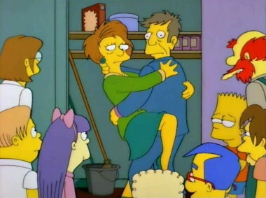 Grade School Confidential (Escuela primaria confidencial en España y Amor en la escuela en Hispanoamérica) es el decimonoveno episodio de la temporada 8 de Los Simpson. Sinopsis[]Todo comienza cuando Martin Prince invita a sus compañeros de clase a su fiesta de cumpleaños, pero el festejo se vuelve muy aburrido. Para terminar de acabar la fiesta, se descubre que la comida estaba envenenada, lo que hace que todos se enfermen y dejen el lugar. Mientras tanto, el director Seymour Skinner y Edna Krabappel tienen una conversación, la cual los hace descubrir los sentimientos románticos que tenían el uno con el otro. Finalmente, se besan en la casa rosa de juguete de Martin, en un acto presenciado por Bart Simpson (uno de los pocos que no había comido y, por lo tanto, no estaba envenenado). Bart planea revelar lo que ha presenciado, pero Seymour y Edna temen ser despedidos si alguien descubría lo de su relación, por lo que le piden a Bart que guarde el secreto. Luego de esto, comienzan a utilizar al niño como intermediario, a cambio de arreglar su terrible expediente. Bart, por un tiempo, guarda el secreto, pero pronto se frustra y cansa, ya que era puesto en situaciones embarazosas repetidas veces. Una tarde en la escuela, luego de hacerlo pasar vergüenza frente a toda la clase diciéndole a Edna "Te amo" (de parte de Seymour), Bart se enfurece y hace poner a toda la escuela frente a Edna y a Seymour en un momento en que se están besando. La noticia se expande rápidamente por todo Springfield, y se va exagerando a medida que se pasa la voz. El jefe de policía Wiggum, luego de escuchar la versión de Ralph de los eventos, alerta al Superintendente Chalmers. Chalmers le da a Seymour un ultimátum: terminar la relación o ambos serían despedidos. Seymour decide que el amor es más fuerte que su trabajo, por lo que Chalmers lo despide a él y a Edna, diciéndoles que se fueran al final del día. Bart se entera de que la pareja había perdido sus trabajos y se siente triste por lo que él, en parte, había causado. Luego de que Seymour se disculpe con Bart por haberlo avergonzado, Bart le dice al director que se rebele contra el sistema, quedándose en la escuela. Seymour y Edna cierran la escuela, y se quedan encerrados en ella con Bart. Luego llaman a la prensa y dan a conocer un mensaje: querían sus trabajos de vuelta y, además, que la comunidad no se interpusiera entre su relación. Sin embargo, los residentes de Springfield (específicamente Maude Flanders) se niegan a aceptarlo, ya que pensaban que no eran adecuados para seguir en la escuela, por ser "indecentes". Seymour insiste que no había pasado nada grave, y que incluso él era virgen. Todos aceptan la explicación, y Chalmers acepta devolverle sus empleos a Seymour y a Edna, como si nada hubiera pasado. La pareja decide continuar con su relación en secreto, convenciendo a Bart de que habían decidido terminar y agradeciéndole por haberlos ayudado. Producción[]La idea de que Skinner y Krabappel sean pareja estaba planeada desde la época en que Mike Reiss y Al Jean eran show runners de la serie. Una escena borrada muestra un momento embarazoso entre Bart, Milhouse y Martin, cuando el último les presenta a los dos a sus padres. El Mago Matemático está basado en Bill Gates. Rachel Pulido tomó inspiración para hacer el episodio de "Bart the Lover", de la tercera temporada. Los pasteles que aparecen en el libro de Agnes Skinner fueron diseñados para que luzcan como si fuesen verdaderos. La escena en la que Homer usa el megáfono para hablarles a Marge y Lisa, quienes estaban paradas al lado suyo, fue añadida por Dan Castellaneta. Recepción[]Los autores del libro I Can't Believe It's a Bigger and Better Updated Unofficial Simpsons Guide, Warren Martyn y Adrian Wood, dijeron que el episodio fue un capítulo encantador, que finalmente establece uno de los temas más recurrentes de la serie: la atracción mutua entre Edna y Seymour. Esto será doblemente reconfortante si se sigue utilizando en episodios posteriores. La escena en la que Agnes Skinner le muestra a Bart su libro de pasteles es una de las escenas favoritas de Matt Groening de toda la serie. Enlaces externos[]