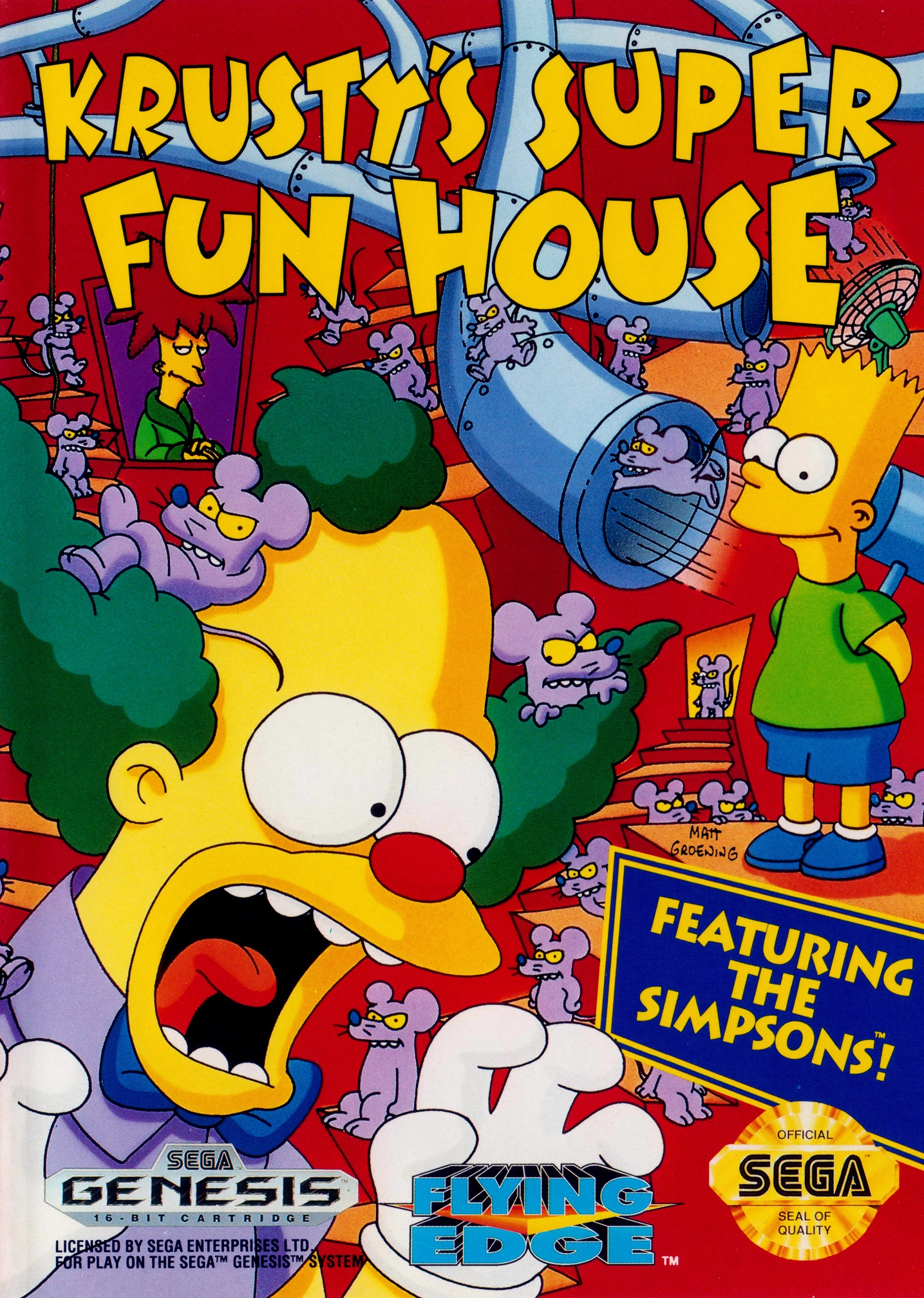 Krusty's Fun House, también conocido como Krusty's Super Fun House, es un videojuego de puzzle de 1992 basado en la serie Los Simpson. Fue desarrollado por Fox William para la compañía Audiogenic bajo el título Rat-Trap y luego licenciado a Acclaim Entertainment que ya había publicado varios videojuegos basados en Los Simpson. Acclaim Entertainment lo publicó para las videoconsolas Nintendo Entertainment System, Sega Master System, Game Boy y Sega Game Gear bajo el título Krusty's Fun House y para las videoconsolas Super Nintendo Entertainment System y Sega Mega Drive bajo el título Krusty's Super Fun House. A su vez Acclaim Entertainment licenció el juego a Virgin Interactive que lo publicó bajo el título Krusty's Super Fun House para computadoras que usaran el sistema operativo DOS y computadoras Commodore Amiga. Mecánica del juego[]El jugador controla a el payaso Krusty en escenarios con scroll horizontal en su objetivo de destruir a todas las ratas que han invidado su Krusty Brand Fun House —Casa de la diversión marca Krusty, en idioma inglés; cada nivel incluye un número determinado de ratas. Usando diferentes objetos, Krusty debe facilitarle el camino a las ratas y guiarlas hacía el dispositivo que las destruirá. En cada nivel, estos dispositivos son controlados por diferentes personajes entre los que se incluyen Bart Simpson, Homer Simpson y Sideshow Mel. En cada nivel también aparecen otras criaturas como serpientes y cerdos voladores que atacaran a Krusty; para derrotarlas el jugador puede arrojarle pasteles. El juego incluye un sistema de contraseñas en el que notablemente todos son nombres de personajes de Los Simpson. La única excepción es la contraseña _Joshua_ en la versión para Super Nintendo Entertainment System, una referencia a la película Juegos de guerra. |