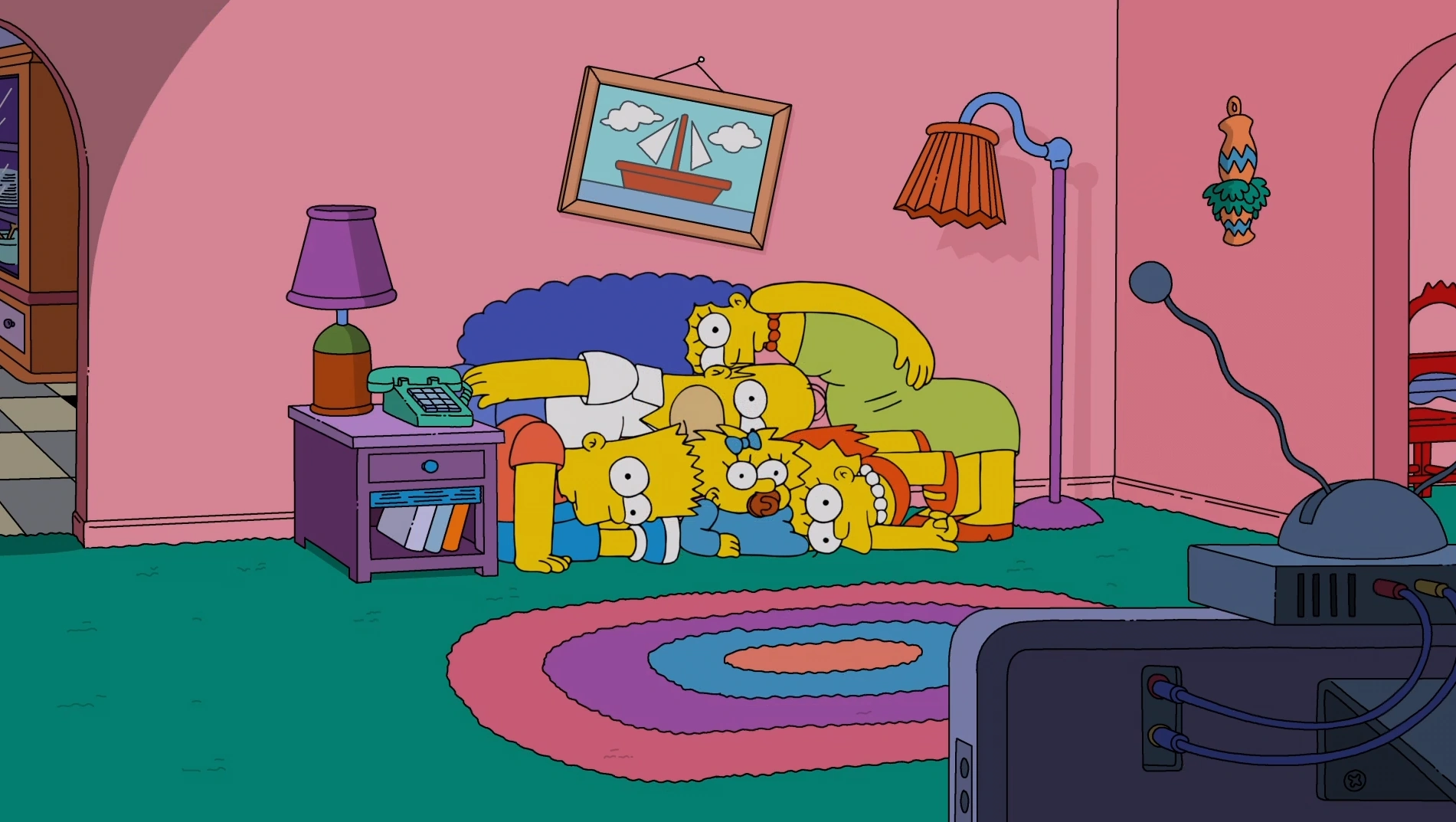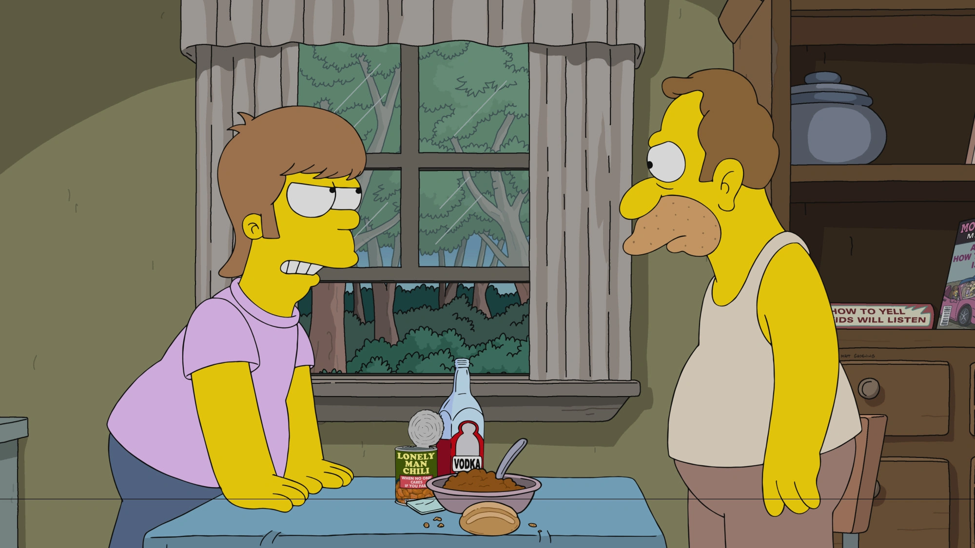 Mothers and Other Strangers (Madres y otros extraños en España e Hispanoamérica) es el noveno episodio de la temporada 33 de Los Simpson. Sinopsis[]Bart está mirando escenas en la televisión, cuando se topa con Muttflix, despertando el interés del pequeño ayudante de Santa. Esto hace que el pequeño ayudante de Santa invite a su madre, She Biscuit, ya que es el Día de la Madre. Bart y Lisa le regalan tazas a Marge que hicieron en la escuela, obsequiándole el mismo regalo que le dieron anteriormente, mientras que Maggie le da un beso de bebé, mientras se burla de ellos por sus tontos regalos. También se dan cuenta de que Homer está triste al escuchar que es el Día de la Madre. Después de regalarle a Marge una foto enmarcada de los niños, continúa llorando al recordar a su difunta madre, Mona. Lisa sugiere que Homer pruebe la terapia en línea. Annette, la terapeuta, lo trae de vuelta hace treinta años, al día en que el abuelo recibió notas de Mona de que el FBI la buscaba y los dejaba. Para evitar tener que explicarlo, el abuelo le dijo a Homer, que entonces tenía 9 años, que estaba muerta. A los 16, Homer recibió una tarjeta postal de Utah de Mona, que estaba siendo monitoreada en secreto por el FBI. Homer confrontó a su padre sobre la verdad, y él y el abuelo luego viajaron a Utah para rastrear a Mona mientras el FBI los seguía. Vieron a Mona en una gasolinera, pero cuando salió corriendo para encontrarse con ellos, el FBI la vio y persiguió a los tres hasta un cañón. Cuando el abuelo se quedó atascado en un pequeño hueco, Homer tuvo que elegir entre su madre y su padre y volvió hacia el abuelo. Mona logró escapar en la camioneta de un hippie y partió hacia San Francisco. De vuelta al presente, el abuelo y Homer le dicen al terapeuta que nunca volvieron a encontrar a Mona. Después de terminar la sesión de terapia, Homer le revela a la familia que Mona lo visitó en secreto a él y al abuelo en el hospital cuando nació Bart, para ver cómo estaba su nieto recién nacido haciéndose pasar por médico. Habiendo logrado un cierre de la muerte de Mona, Homer lleva a la familia a comer. Durante los créditos, Homer duerme con una botella de jarabe de arce y sueña con bailar en círculo con su familia y antepasados en un homenaje a 8½. |
