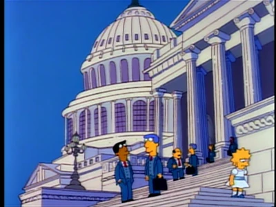Mr. Lisa goes to Washington (La familia va a Washington en España y El Patriotismo de Lisa en Hispanoamérica) es el segundo episodio de la temporada 3 de Los Simpson. Sinopsis[]Todo comienza cuando después de haber recibido una copia gratis de la revista Selecciones del Reader's Digest, Homer se vuelve fanático de la misma. Cuando ve a los niños sentados enfrente del televisor, se los apaga y les ordena escucharlo leer un artícuo del libro. Además, le propone a Lisa participar en un concurso organizado por la revista, en el cual debe presentar un ensayo mostrando qué maravilloso es Estados Unidos. Lisa va al bosque de Springfield, en donde toma inspiración para escribir el ensayo. El trabajo de Lisa, como es muy bueno, llega a la final del concurso, por lo que la familia debe viajar a Washington para seguir compitiendo. Como el ensayo había sido pulcramente escrito, los miembros del jurado pensaban que tal vez había sido escrito por un adulto, pero al ver el pésimo vocabulario de Homer y la inteligencia de Lisa, deducen que la niña es la autora del escrito. Mientras Bart y Homer abusan de los beneficios pagados por los editores de la revista Reader's Digest, Lisa visita monumentos famosos para inspirarse. En una estatua en particular, escucha sin ser vista una charla entre dos funcionarios del gobierno, que planeaban destruir el bosque de Springfield. Desilusionada al ver cuán deshonestos eran los políticos, Lisa rompe su ensayo, llorando, y escribe uno nuevo, doloroso y mostrando la verdad de su país. El nuevo ensayo, al estar escrito mostrando el lado oscuro del gobierno, menciona los nombres de los funcionarios que planeaban destruir el bosque. El trabajo de Lisa causa mucho revuelo, y hace que el jurado y la audiencia se vuelva hostil con ella. Obviamente, todos se asombran al oír el ensayo, excepto Bart, a quien el trabajo le parece muy bueno, y quiere que Lisa gane el concurso. El mensaje del trabajo circula rápidamente por Washington, y causa que los funcionarios corruptos sean arrestados, pero Lisa no gana el concurso. De todas formas, la niña se siente feliz al ver que la justicia había prevalecido, lo que la hace volver a confiar en el gobierno. Enlaces externos[]