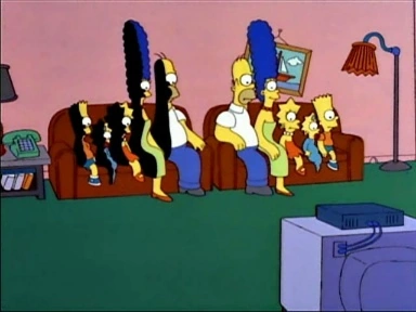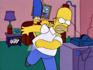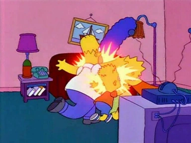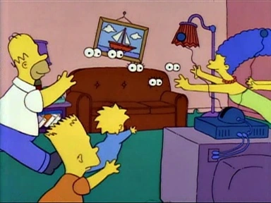 | La familia corre al sillón, chocan, y explotan. El chupete de Maggie cae al suelo en la sala de estar ennegrecida. | |||