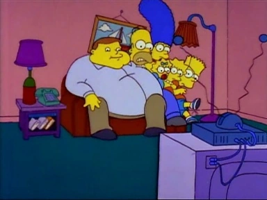 | La familia corre al sillón, pero hay un hombre obeso sentado en él. Éste se corre al costado, dejándoles muy poco lugar. | |||