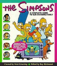 The Simpsons: A Complete Guide to Our Favorite Family, traducido al español, Los Simpson: Una guía completa sobre nuestra familia preferida, es un libro publicado en 1997 por HarperCollins. Fue editado por Ray Richmond y Antonia Coffman; Matt Groening recibe el crédito como el creador de Los Simpson, la serie de televisión sobre la cual se basa el libro, y también por una introducción del libro. Aunque el título del libro incluye la palabra "completa", el libro es una guía de episodio por episodio de Los Simpson. El libro es notable como una "guía definitiva". Según Matt Groening, el libro por poco fue titulado "Enciclopedia Simpsonica". Caracteristicas[]Las páginas 10 y 11 son biografías cortas de cada uno de los cinco miembros de la familia Simpson, Homer, Marge, Bart, Lisa y Maggie. También tiene otras mini-biografías sobre otros personajes, como Santa's Little Helper, Snowball II, o el Comandante Willem Dafoe ("The Secret War of Lisa Simpson"). Cada episodio ocupa una o dos páginas, incluyendo una sinopsis, créditos, cuadros, y escenas memorables, también los gags de la pizzarra de cada episodio. Al principio de cada temporada aparecen las características especiales, como una lista una descripción de los cortos de Los Simpson, una lista de los D'oh! de Homer, y una lista de episodios de Itchy and Scratchy. Secuelas[]Impreso en 1997, el único libro que cubre las temporadas que habían sido transmitidas hasta ese entonces (las 8 primeras temporadas). Por lo tanto, es seguida por dos secuelas, The Simpsons Forever!, Que abarca las temporadas 9 y 10, y The Simpsons Beyond Forever!, Que abarca las temporadas 11 y 12. Estos tres volúmenes a su vez han sido recogidos y re-publicados en The Ultimate Simpsons in a Big Ol' Box. Esto fue seguido por una tercera secuela, The Simpsons One Step Beyond Forever!, Que abarca las temporadas 13 y 14. Lista de libros[]
