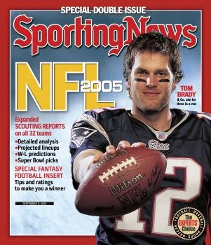 Thomas Edward Brady Jr. en 2005, año en el que se estrenó el episodio en el que sale. Traducción de la portada de revista: # Doble especial americano. Deportes. Informes de exploración de los 32 equipos. Análisis detallado. Alineaciones proyectadas. Predicciones. Selecciones. Fantasías futbolísticas. Notas y consejos para ser un ganador. Elecciones expertas.