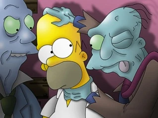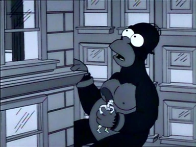 The Simpsons Halloween Special III (La casa-árbol del terror III en España y Especial noche de brujas III en Hispanoamérica) es el quinto episodio de la temporada 4 de Los Simpson. Sinopsis[] Los Simpson celebran una fiesta de Halloween en su casa, con la mayoría de los niños de Springfield. Lisa, el Abuelo y Bart cuentan cada uno una historia de terror. Los disfraces de Halloween incluyen a Homer como Julio César ](aunque acaba en calzoncillos al atorarse su toga en el pasamanos de la escalera), Marge como Cleopatra, Bart como Alex DeLarge de La Naranja Mecánica, Lisa como la Estatua de la Libertad, Martin como Calíope, Nelson como un pirata, Janey como un hada, Wendell como un astronauta, Lewis como el monstruo de Frankenstein y Ned Flanders como un zombie sin cabeza. Clown Without Pity[]HA: El payaso sin piedad. E: el muñeco sin piedad Muñeco Krusty ![]() El segmento comienza en el cumpleaños de Bart, en la casa de los Simpson. Homer, repentinamente, se da cuenta de que había olvidado de comprarle un regalo de cumpleaños a Bart, por lo que va a comprarle uno en una tienda en donde se vendían artículos de magia negra. Allí, compra un muñeco parlante de Krusty el Payaso. El vendedor le advierte que el muñeco tiene una maldición, pero Homer no le hace caso ya que el vendedor le dice que le dará un yoghurt junto con el muñeco. Luego, regresa a la fiesta, y le regala el muñeco a Bart. El Abuelo comienza a decir que el muñeco es malo, pero admite que sólo lo hacía para llamar la atención. Más tarde, cuando Homer juega con el muñeco, éste le dice que lo va a matar. Al principio no le hace caso, pero luego el muñeco lo amenaza con un enorme cuchillo. Después de que el muñeco intente matarlo muchas veces más, Homer lo mete en una bolsa, lo encierra en una valija y lo arroja a un "Pozo sin Fondo". Cuando regresa a su casa, Homer se recuesta en la sala, pero se encuentra al payaso, que había logrado escapar. Marge finalmente ve al muñeco ahorcando a Homer (antes, ningún miembro de la familia le había creído a Homer), y llama a la compañía "KrustyCo" para que le ayuden. Un encargado de la empresa arregla el problema, moviendo el interruptor del muñeco de "Malvado" a "Bueno". Finalmente, el muñeco Krusty se convierte en el sirviente de Homer. King Homer[]HA: King Homero. E:el rey homer ![]() En un segmento en blanco y negro, Marge acompaña al Sr. Burns y a Smithers a una expedición a la Isla del Simio, para encontrar al legendario King Homer. Después de aterrizar en la isla, el Sr. Burns, Smithers, y Marge ven a la tribu nativa, pero son atrapados, ya que el cabello de Marge podía ser visto por sobre los arbustos. Los nativos se ponen de acuerdo en que "La mujer del cabello azul haría un buen sacrificio" y la atan a un poste. Un sonido de tambores presenta a King Homer (quien estaba ocupado peleando con un dinosaurio gigante). Marge está aterrorizada al principio, pero luego ve el lado amable de Homer cuando él queda atraído con el perfume de la dama, y se hacen amigos. Sin embargo, el Sr. Burns captura a King Homer gracias a una bomba de gas. De regreso a Nueva York, el grupo presenta a King Homer en el teatro Broadway. Los flashes de los fotógrafos enfurecen a King Homer, quien se libera de sus cadenas. Luego, secuestra a Marge y camina por la ciudad, comiendo a mucha gente. Después, trata de escalar el Empire State, pero no logra llegar muy alto. King Homer cae al suelo, exacto, y Marge le sugiere comer más vegetales y menos gente. Finalmente, King Homer y Marge se casan. La historia termina con la boda, y King Homer se come al padre de Marge (a pesar de que Marge no está enojada). ¡Te dije uno! - Barney Gumble a King Homer despues de ofrecerle un cacahuete y este se comiese toda la bolsa. Todo esta historieta hace referencia a la famosa película King Kong. Dial 'Z' For Zombies[]HA & ESP: Marque Z para Zombies. E: pulse Z para zombies Mientras busca libros en la biblioteca de la Escuela Primaria de Springfield para un reporte, Bart encuentra un libro de magia negra en la "Sección Oculta" de la biblioteca. Esa noche, cuando Lisa le recuerda que ese día se cumplía un año de la muerte de su gato, Snowball I, Bart sugiere que podrían usar el libro para resucitar al gato. En el cementerio de mascotas de Springfield, Bart pronuncia un hechizo del libro, pero accidentalmente reanima cadáveres humanos, que descansaban en paz en el cementerio aledaño. Los zombies aterrorizan a Springfield, volviendo zombie a mucha gente, incluyendo al director Skinner, Ned Flanders, y Krusty the Clown. Mientras tanto, la familia Simpson sella todas las puertas y ventanas excepto la puerta trasera, la cual estaba a cargo de Homer, quien había preferido quedarse viendo televisión antes que ir a cerrarla. Muchos zombies entran en la casa y comienzan a perseguir a la familia. Lisa se da cuenta de que la biblioteca debía tener un libro con un contrahechizo para la maldición. La familia corre hacia el auto, bajo la protección de la escopeta de Homer. Flanders aparece y pregunta si puede morder la oreja de Homer. Homer le responde disparándole y matándolo con su arma. La familia grita, sorprendida, que había matado al zombie de Flanders. Homer responde: "Ah, ¿era un zombie?" Los Simpson, luego, llegan a la Primaria de Springfield y entran, matando a los zombies que se les cruzan en el camino. Numerosos muertos tratan de atacar a la familia, incluyendo a George Washington, Albert Einstein, y William Shakespeare. Homer les dispara a todos y la familia llega a la sección oculta de la biblioteca. Bart, desesperado, busca el libro adecuado, mientras los zombies tratan de entrar por la puerta. Bart logra encontrar el libro y pronunciar el contrahechizo, por lo que los zombies regresan a sus tumbas. La mañana después del desastre, el Alcalde Diamante da un discurso a la ciudad parodiando los discursos de los finales de las películas cuyo tema principal es una