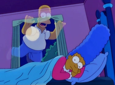 Treehouse of Horror X | Treehouse of Horror XI | Treehouse of Horror XII _________________________________________________________________ The Simpsons Halloween Special XI (La casa-árbol del terror XI en España y El Decimoprimer Especial de Noche de Brujas en Hispanoamérica) es el primer episodio de la temporada 12 de Los Simpson. Sinopsis[]Secuencia de Apertura[]El episodio comienza cuando se muestra el titulo The Simpsons Halloween Special XI, luego se muestra una mansion, que resulta ser de Los Simpson, despues se muestra a Los Simpson parodiando a Los Munsters, con Homer como Herman Munster, Marge como Lily Munster, Lisa como Marilyn Munster con un libro sobre la ley de derechos de autor, Bart como Eddie Munster, y Abe como Abuelo Munster. Frente de su mansión, aparece una furiosa turba de vecinos que apuñalan a Marge y Abe, prenden fuego a Homer y apresan con un cepo a Bart. Luego, ellos se alejan dejando a Lisa, que despues ella se va dejando a los cadaveres de su familia en la mansion. Esta secuencia es en blanco y negro y el tema de los Simpson es similar al tema de The Munsters. G-G-Ghost D-D-Dad[]Mientras desayuna, Homer lee su horóscopo, en el que se dice que va a morir ese día, y alguien va a felicitarlo en su trabajo. El horóscopo de Marge dice que su marido morirá. Homer no hace caso de las predicciones y se marcha al trabajo. En su camino al trabajo, escapa por poco de la muerte varias veces. Al llegar a la central nuclear Lenny le hace un cumplido... acerca de la serpiente de cascabel que lleva colgada del brazo. Como todavía está vivo al final del día (a pesar de las múltiples lesiones) se mofa del horóscopo, pero finalmente muere ahogado después de comer un trozo de brócoli (probando que el horoscopo no era tan estupido despues de todo), que según informa el doctor Hibbert a Marge es "el vegetal más mortífero de la Tierra. ¿Por qué? Trata de advertirnos con su horrible sabor". Cuando Homer llega al Cielo, San Pedro le informa de que no ha hecho ninguna buena acción en su vida y le pide que para entrar en el Cielo debe regresar a la Tierra en forma de fantasma y hacer una buena acción en menos de 24 horas. Durante las 24 horas siguientes, Homer intenta hacer buenas acciones pero sin demasiado éxito: sólo recibe un coscorrón de Nelson Muntz y deja caer accidentalmente a Agnes Skinner y ella muere (la excusa de Homer de que ella iba a ser el próximo Hitler no es suficiente para entrar en el Cielo). Pero cuando sólo quedaba un minuto para cumplir el plazo, Homer salva a un bebé que iba dentro de un carrito que rodaba por unas escaleras y que después explota en la calzada. Seguro de que esa acción será suficiente para entrar en el Cielo se dirige hacia allí, donde San Pedro se disculpa por estar distraído mientras Homer hizo su buena acción. Por tanto, cuando Homer dice Me llevan todos los diablos, San Pedro envía a Homer al Infierno por toda una eternidad, donde Satanás le da coscorrones y le pide que deje de gritar porque despertará a John Wayne, que ya se ha levantado para su Día en el Infierno. Scary Tales Can Come True[]La familia Simpson son una familia de campesinos que viven en una cabaña de calabaza, con Homer como zopenco del pueblo. Cuando Homer se prende fuego y no pueden permitirse obtener comida, Homer afirma que ningún niño pasará hambre en su hogar. Entonces abandona a Lisa y a Bart en un bosque cercano, donde ellos encuentran a otros hermanos suyos abandonados anteriormente por Homer y convertidos en esqueletos. Lisa, usando su libro de Cuentos de hadas de los hermanos Grimm, les guía a través de los numerosos peligros del bosque, incluido un trol debajo de un puente (encarnado por Moe Szyslak) o los tres ositos del cuento Ricitos de oro y los tres osos, mucho más agresivos que en la historia original. Mientras tanto, Marge reprende a Homer por abandonar a sus hijos y le ordena que los traiga de vuelta. Mientras Homer está buscando a sus hijos se encuentra con la torre de Rapunzel. Rapunzel invita a Homer a salvarla y le arroja su melena para que suba por ella hasta la ventana pero como Homer pesa tanto que sólo puede recorrer un pequeño camino, se escucha un grito de dolor y la melena de Rapunzel cae al suelo, provocando la caída de Homer. Homer esconde la cabellera debajo de un arbusto y huye. Los chicos llegan a la casita de pan de jenjibre donde una bruja les invita a entrar. Pronto Lisa es encadenada y Bart comienza a engordar para ser comido, representando a Hansel y Gretel. Antes de que la bruja intente cocinarlos ellos la distraen diciéndole que no tiene buena apariencia y ella se excusa diciendo que tiene una cita con su novio, George Caldero. En ese momento aparece Homer comiéndose parte de la casita de jenjibre. La bruja golpea repetidamente a Homer, convirtiéndole en mitad pez mitad gallina entre otras cosas. Ella intenta cocinarlo en el horno pero Homer la domina y la mete dentro del horno y cierra la puerta. Cuando ella muere, Homer vuelve a ser normal y la familia se sorprende al ver aparecer a un chico guapo cuyo nombre es George Caldero y afirma tener una cita con Suzanne. Más tarde, la familia está cenando y Marge dice que aunque ellos siguen siendo pobres no volverán a pasar hambre gracias a Homer, que puede poner huevos dado que la parte inferior de su cuerpo es de gallina. The Night of the Dolphin[]Lisa va a un parque acuático donde se apiada de un delfín llamado Snorky. Lisa libera a Snorky pero lo que ella no sabe es que él es el rey de los delfines y está muy resentido con los humanos por obligarlo a hacer trucos y crea un plan para conquistar el mundo. Los delfines comienzan su ofensiva atacando Springfield, asesinan a Lenny en el mar (el Jefe Wiggum ve las heridas obviamente causadas por los delfines y se las atribuye a adolescentes alborotados) y marchan hacia la ciudad sobre sus colas. Snorky irrumpe en un pleno del Ayuntamiento, sube al estrado y les dice a los habitant