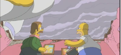Treehouse of Horror XXII (La casa-árbol del terror XXII en España y La casita del horror XXII en Hispanoamérica) es el tercer episodio de la temporada 23 de Los Simpson. Sinopsis[] Secuencia de Apertura[]Homer se zambulle peligrosamente en un aislado cañón en Candy Peak, pero uno de sus brazos queda atrapado por una roca, intenta morderlo para alcanzar los dulces que se suponía debía llevar a otro lugar, pero en vez de eso muerde y arranca su pierna y el brazo contrario, luego se da cuenta que en vez de dulces hay vegetales, con una nota de Bart. Mientras él se encuentra en su cuarto junto a Lisa y Maggie comiéndose los dulces, la secuencia termina cuando Bart abre la boca y se puede ver escrito el título Treehouse of Horror XXII y luego se muestran los créditos iniciales. The Diving Bell and Butterball[]Homer despierta despues de que Bart le habla, sin poder mover un músculo intenta recordar lo sucedido: cuando estaba decorando la casa para Hallowen una araña venenosa entró en la caja de decoracion y Homer pensando que era parte de la decoración la toma y la aprieta, incluso la molesta con un destornillador, por lo que lo muerde. La picadura lo deja paralizado, sin embargo su familia esta allí para acompañarlo en su desventura. Cuando Lisa le intenta leer un libro Homer se tira gases con la intención de evitar su lectura. pero Lisa descubre que es una habilidad de Homer para comunicarse, él tendrá la oportunidad de expresar su amor por Marge. Pasa un tiempo y Homer ya está acostumbrado y más feliz que siempre, cuando se acerca otra araña (radioactiva) y lo pica, lo que le da los poderes del hombre araña aún paralizado. Dial D for Diddily[]Ned Flanders arroja los restos de una persona al lago, entonces ve también al Sr. Burns tirando barriles de desecho tóxicos, en ese momento una voz suprema se escucha y le ordena matar al Sr. Burns, por lo que Ned lo decapita. Otro día sucede algo parecido con Snake y también lo asesina. Después la supuesta voz de "Dios" ordena matar a Patty y a Selma y así sucede. Luego de eso Ned descubre que la voz que lo ordenaba matar era la de Homer y lo amenaza de muerte, éste lo elude diciéndole que Dios no existe y quema la Biblia de Ned, allí aparece Dios y lo estrangula, al final aparece el Diablo y su pareja Maude Flanders, ex-esposa de Ned. Se ve que el diablo manda a Dios. In the Na'Vi[]Bart y Milhouse tienen asignada la misión de infiltrarse en la zona sagrada de un planeta distante para conseguir una sustancia que haga que las personas se rían de los chistes de Krusty. Para conseguirlo, se transforman en avatares de los cíclopes indígenas, algo como la forma de Kang y Kodos y luego de varios días consiguen el secreto de la ubicación de la preciada sustancia. Bart, quién se enamoró de una habitante del planeta se ve atrapado en una guerra planetaria y ayuda a su nueva familia a luchar en contra de los habitantes de la Tierra, al final ganan la batalla. Al final del episodio y como es habitual aparecen todos los personajes y termina el show.