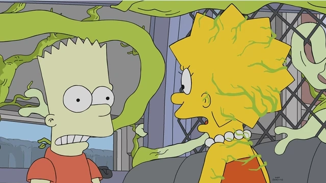 Treehouse of Horror XXIX (La casa-árbol del terror XXIX en España y La casita del horror XXIX en Hispanoamérica) es el cuarto episodio de la temporada 30 de Los Simpson. Argumento[]Secuencia de apertura[]Homer Simpson derrota a Cthulhu en un concurso de comer ostras. Cthulhu vomita y pregunta qué quiere Homero. Homero susurra: "Quiero comerte". Luego vemos a Cthulhu en una olla gigante y a los Simpson (excepto Lisa) disfrutando de un perrito caliente hecho de los tentáculos de Cthulhu. Instantes después Homer explota una de las bolsas de tinta de Cthulhu y forma con la misma el logo "Treehouse of Horror XXIX", con la cual también forman los créditos de la televisión. Intrusion of the Pod-y Switchers[]El segmento comienza con una base submarina de Mapple, donde Steve Mobbs (en una pantalla) habla sobre el nuevo Myphone y la nueva versión no divertida de él a un público emocionado. Cuando todo el mundo está al teléfono, el poco divertido Steve se revela como una planta alienígena en una misión. Ahora en el planeta de las plantas, disparan esporas a la Tierra (yendo justo al lado de la nave Planet Xpress de "Futurama"), con un paño que diga "TRAER FUTURAMA" y luego ser volado por The Orville). En Springfield, cada uno se convierte en una versión vegetal de sí mismo. Dice que esto es un homenaje a la película "La invasión de los ladrones de cuerpos", mientras que la película en sí misma fue una estafa de "La cosa de otro mundo". Cuando la versión en planta de Comic Book Guy dice "pad," Milhouse y Bart se asustan y huyen. La Gente de las Plantas ve a los ciudadanos con vainas (productos Mapple) y les pregunta dónde las encontraron. Bart dice que lo encontraron bajo el árbol de Navidad. Multiplisa-ty[]Después de una pijamada en casa de Milhouse, Milhouse, Nelson, y Bart se encuentran en una celda, repentinamente liberados por Penélope, la que los atrapó en ella. Penélope, que en realidad es Lisa con múltiples personalidades -- similar al personaje de James McAvoy Kevin Wendell Crumb de Split - actuando de manera extraña, los vuelve a encerrar después de que no piden una repetición de su actuación. Lisa ataca y mata a Milhouse y Nelson, antes de que Bart le pregunte qué le sucedió, y Lisa le cuenta la historia: Bart agarró el examen de ortografía de Lisa, cambiando sus respuestas, burlándose de Miss Hoover y dándole una F. Lisa tiene un último cambio y le da a Bart una última oportunidad de salvarse y se redime, salvándose de ser asesinado por la basura, mientras que Milhouse se transformó en un "chico del periódico". Geriatric Park[]En una parodia de Jurassic Park, el Sr. Burns abre una casa de retiro con temas jurásicos, un parque lleno de ancianos rejuvenecidos que mezclan su ADN con el de los dinosaurios". Lleva a los ciudadanos de Springfield al parque, mostrándoles la nueva "casa de retiro". Al principio todos son humanos, sanos y se sienten jóvenes de nuevo, con una fuerza increíble también. Una vez que Homero sube la temperatura después de que el Abuelo se queja de que la temperatura es demasiado fría con Homero también citando "No estoy leyendo, estoy de vacaciones." después de ver la señal de advertencia, se transforman en versiones de dinosaurios de sí mismos. Los visitantes y el Sr. Burns, matan a los ancianos, Agnes Skinner como un Ludodactylus, come del brazo del Director Skinner, Jasper como un Dilophosaurus le arranca la cabeza a Kirk Van Houten, y la familia Simpson están amenazadas por el abuelo y Jacqueline Bouvier (convertidos en un Indominus rex y un Parasaurolophus respectivamente). Lisa se enfrenta valientemente al abuelo y descubre que todos ellos sólo necesitan ser apreciados y respetados. Al final, los Simpson escapan vivos e ilesos, aunque su helicóptero está siendo pilotado por la transformada Agnes.