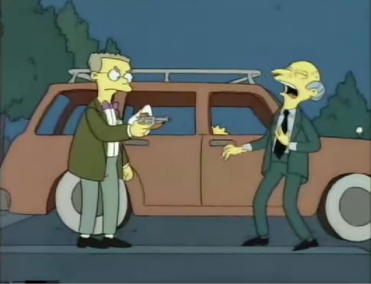 Who Shot Mr. Burns? (¿Quién disparó al Sr. Burns? en España y ¿Quién mató al Sr. Burns? en Hispanoamérica) es el primer episodio de 2 partes de Los Simpson. La primera parte fue el vigesimo quinto y último episodio de la temporada 6 y la segunda parte el primer episodio de la temporada 7. SinopsisPrimera parteEl episodio comienza cuando el director Skinner camina por la Escuela Primaria de Springfield y descubre que el hámster mascota del cuarto grado había muerto. Skinner le ordena al conserje Willie que enterrase el animal, pero mientras cava la tumba encuentra petróleo, haciendo rica a la escuela. Skinner y el Superintendente Chalmers piensan formas de gastar el dinero, aceptando algunas sugerencias de los estudiantes, incluyendo el consejo de Lisa de incluir a Tito Puente como profesor de música. En la Planta de energía nuclear de Springfield, Homer descubre que el Sr. Burns no era capaz de recordar su nombre, pese a que había trabajado para él desde hacía diez años. Burns descubre que la escuela tiene un pozo de petróleo y decide apoderarse del mismo. Tras fracasar en su primer intento (intentar engañar al director Skinner disfrazándose de alumno para convencerlo de cederle los derechos del pozo), Burns recurre a una forma más deshonesta: colocar un taladro inclinado para sacarlo, obteniéndolo antes que la escuela. La perforación del pozo llevada a cabo por el Sr. Burns causa daño y sufrimiento a varios ciudadanos de Springfield: por los gases emanados por el petróleo la taberna de Moe cierra y Moe y Barney se enfurecen; el Asilo de Ancianos de Springfield, que se hallaba sobre un punto importante del pozo, colapsa y el Abuelo se queda sin hogar; la casa del árbol de Bart se destruye, ya que al empezar a salir el petróleo el chorro dio directamente con esta, y Santa's Little Helper sufre lastimaduras; y debido a la pérdida de dinero de la escuela, debido a contruir, operar y tener que destruir su taladro, Tito Puente, el señor Largo y el conserje Willie son despedidos al tener la escuela que eliminar el programa de música y el mantenimiento. Smithers, quien veía lo ocurrido junto con su jefe, intenta sin éxito hacer que el Sr. Burns sintiera remordimiento por las consecuencias de sus actos, recibiendo de respuesta los deseos de Burns por robarle un caramelo a un niño. Mientras con los Simpson, Lisa, al entersarse por Tito Puente lo que Burns había hecho, le reclama a Homer por trabajar para él, pero Homer, quien le había mandado al Sr. Burns una caja de chocolates con la foto de la familia para que Burns lo recordara, lo empieza a defender mencionando la nota que Burns había mandado a la familia en agradecimiento por los chocolates hasta que, por mención de Lisa, se da cuenta de que el suyo es el único nombre que no aparece en la tarjeta, pues si bien el Sr. Burns vio la foto en el fondo de la caja, el chocolate que cubría su cara fue el único que no tocaron ni él ni Smithers. Homer, al darse cuenta de ésto, les pide a Bart y Lisa que salgan, y una vez solo, toma aire y grita la que según Ned Flanders era "la grosería más fuerte que había oido"(aunque el público no la llega a oír pues se tapa con el sonido del órgano de la iglesia). Burns, luego, le revela a Smithers su mayor plan: la construcción de un disco movible gigante que podría bloquear permanentemente al sol en Springfield, obligando a los residentes a utilizar a todo momento la electricidad de su planta nuclear. Smithers, horrorizado, finalmente decide desafiar a Burns, insistiéndole en que había llegado demasiado lejos; éste, en respuesta, lo despide. Homer más tarde entra en la oficina de Burns y pinta su nombre en la pared con aerosol, esperando que Burns pudiese recordarlo. Burns lo ve escribiendo, pero sigue sin reconocerlo, por lo que Homer, furioso, lo ataca. Homer es arrastrado fuera del edificio por los empleados de seguridad, jurando venganza a Burns. En una reunión de los ciudadanos de Springfield llevada a cabo en el Ayuntamiento, la familia Simpson, junto con sus vecinos, furiosamente relatan sus problemas con el Sr. Burns al alcalde Quimby, terminando Bart con mostrarles lo que le hizo a Santa's Little Helper. Repentinamente, aparece Burns en el lugar, burlandose cínicamente de la condición del perro y de haber robado el petróleo, ofreciendo al niño venderle aceite de petróleo, pero cuando Bart esta por abalanzarse sobre el, Burn revela que está armado con una pistola para protección personal tras ser atacado por Homero (a quien para frustración de éste se refiere como "un desconocido"). Luego procede a activar el dispositivo para bloquear el sol, declarando que nadie sería capaz de detenerlo. Riendo de manera cruel, Burns abandona la sala. La cámara lo muestra caminando por un callejón, mostrando simplemente su sombra. Burns puede ser oído diciendo: "Oh, eres tú, ¿por qué estás tan feliz? Ya veo. Creo que sería mejor que me lo des", mientras pelea con alguien, hasta que suena un disparo. Luego camina sin rumbo y cae sobre el reloj de sol de la ciudad. Los residentes de Springfield encuentran su cuerpo, pero nadie logra adivinar quién había sido el agresor, ya que todos tenían algo contra él. El jefe Wiggum dice que él resolvería el caso. Segunda parteAl comienzo de la segunda parte, el Sr. Burns se encuentra hospitalizado en estado de coma y la policía de Springfield trabaja para encontrar al agresor. Su principal sospechoso es Waylon Smithers quien, luego de despertar en su apartamento con una fuerte resaca, recuerda vagamente haberle disparado a alguien la noche anterior. Smithers es arrestado hasta que Sideshow Mel se da cuenta de que Smithers, a la hora del disparo, debía estar en su hogar viendo Pardon My Zinger por televisión. Finalmente, se descubre que Smithers le había disparado a la pierna de madera de Jasper Beardley; luego, es liberado. Luego de eliminar al principal sospechoso, la policía descarta a otros, inc