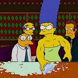 "The Strong Arms of The Ma" is the ninth episode of Season 14, and the 300th episode of The Simpsons in both production and broadcast order, though "Barting Over" (the 302nd episode in production code order) was advertised on FOX as being the show's 300th episode. Marge develops agoraphobia...