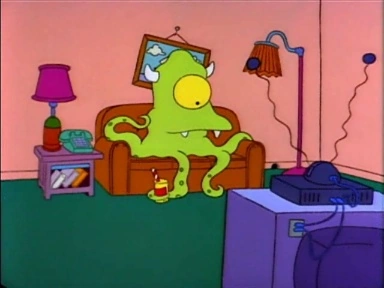 | Sul divano è seduto un alieno, che scappa prima che entrino i Simpson. | ||