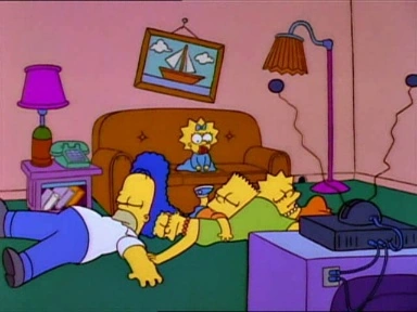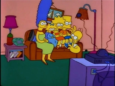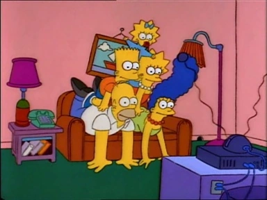 | Bart si sdraia sugli altri membri della famiglia, già seduti sul divano. | ||
