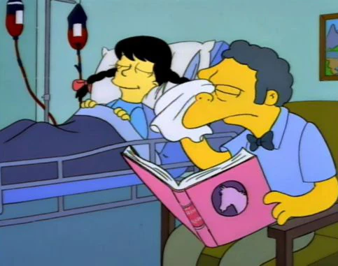 Moe wzrusza się, czytając dziewczynce książkę w szpitalu