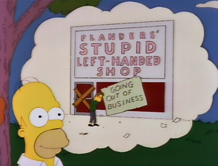 Podczas przyjęcia u FlandersówNed ogłasza, że otwiera sklep dla osób leworęcznych. Homer życzy swojemu sąsiadowi bankructwa, co wkrótce się spełnia. Tymczasem Bart zapisuje się na lekcje karate, lecz z czasem dochodzi do wniosku, że nie jest to tak interesujące, jak przypuszczał.