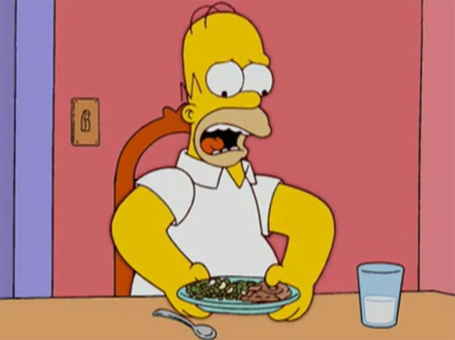 - Homer: "Minha mente sempre está aberta a novas ideias... ... ... cebola?!? Nas ervilhas?? Que droga!" (arremessa o prato)