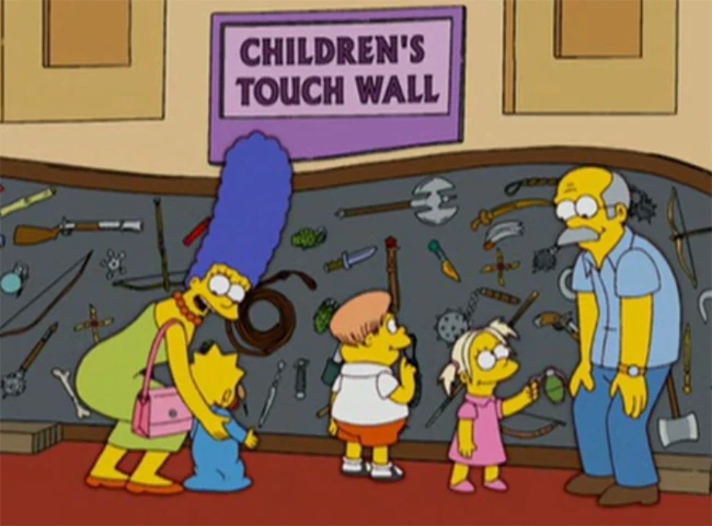 Bart chega satisfeito em casa no fim do dia; é quando Lisa aparece para cobrar a atividade de verão que prometeram à ela, visitar um museu. No dia seguinte a família vai ao Museu de História Natural da cidade. Para alegria dos homens (e desapontamento das mulheres), bem na hora que eles chegam a Exposição de Tecelagem é substituída pela Exposição de Armas. A fila para entrar está bem comprida, mas Homer dá um jeito de seu vizinho Ned Flanders, acompanhado de seus filhos, "colaborar"; Ned e os meninos vão para o fim da fila. Lá dentro, enquanto Homer e Bart assistem um filme 3D, Marge "diverte-se" com Maggie numa sessão bem infantil.
