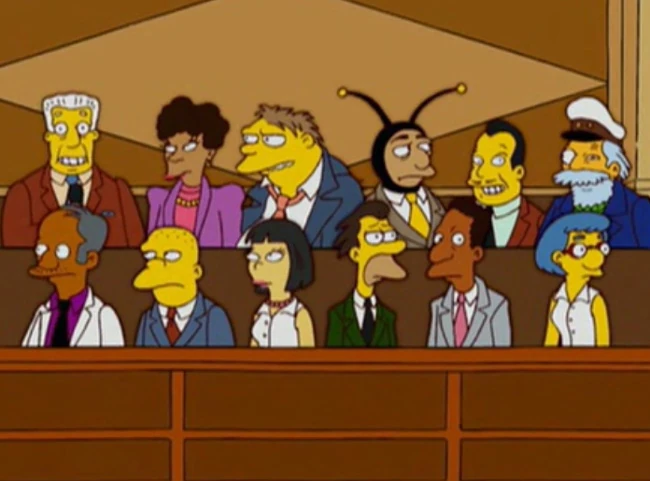 - Os 12 jurados no caso Deus vs. Lisa são: Kent Brockman, Bernice Hibbert, Barney, Bumblebee Man, o "Cara que diz Siiimmm", Capitão McCallister, Sanjay (irmão de Apu), Kearney, Cookie Kwan, Lenny, Carl e Luanne Van Houten.