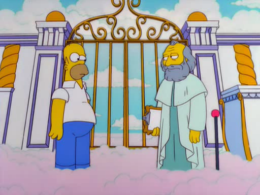 chance de entrar, mas somente se ele fizer uma boa ação nas próximas 24 horas. Na forma de um fantasma, Homer volta para a Terra. Sua tentativa de ajudar Agnes Skinner atravessar uma rua movimentada falha quando ele a deixa cair acidentalmente. Mais tarde, Homer tenta a