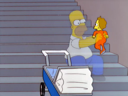 quando o carrinho estava indo desgovernado para o meio da rua. Homer volta ao céu e descobre que São Pedro estava distraído enquanto ele salvava a vida do bebê. Mais tarde, Homer está fervendo no inferno, onde o Diabo está condenando-o a uma vida eterna de sofrimento. Então, o Diabo pega Homer e lhe dá uma gravata, apertando-o, exatamente como Nelson havia feito antes. quando homer perguntou a são pedro ¨¨ voces não vem tudo ¨¨ ele respondeu ¨voce está falando