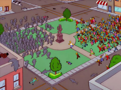 Quimby]] tenta restabelecer a ordem. De repente, Snorky e seus seguidores invadem a sala. Snorky se dirige às pessoas e explica como, milhões de anos antes, os ancestrais do homem levaram sua raça para o mar. Agora os golfinhos pretendem fazer a mesma coisa com os humanos. Um batalha começa, mas as pessoas de Springfield não são páreo para os golfinhos...e term