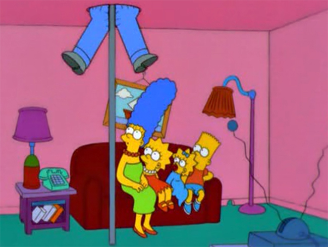 A família entra na sala através dum buraco no teto, escorregando por um poste, tipo aqueles usados por bombeiros nos alojamentos. Todos descem ao sofá menos Homer, que fica entalado no burado, esperneando e reclamando.