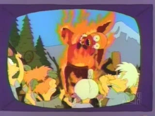 Queridos Papai e mamãe, não mais temo o inferno, pois estive no Acampamento Krusty. Nossas caminhadas na floresta se tornaram marchas para morte. O centro de artesanato, é na verdade um salão de trabalhos forçados. Bart resiste bravamente graças à crença inabalável na vinda de Krusty, o Palhaço. Mas eu sou muito mais pessimista. Não sei se receberam esta carta pois nossos meios de comunicação foram cortados. O esforço para escrever deixou-me tonta então, termino pedindo: SALVEM-NOS, SALVEM-NOS