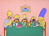 Começa com Marge chamando para o jantar, mas ninguém vem a mesa, quando ela fala que é sobremesa todos vem correndo. Na hora de agradecer Homer diz "Boa bebida, boa carne, bom Deus, vamos comer!". Depois Marge diz que o jantar está muito silencioso, precisa de mais conversa, então Homer manda Bart ligar a tv.