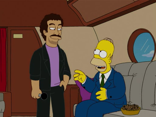 Lionel Richie. Quado chega a hora de voltar para casa Homer fica deprimido e Marge decide contratar um Psicólogo para fazer Homer melhorar de vida. A coisa da tão certo que Homer logo e chamado para uma entrevista de emprego numa fábrica do Rich Texan, de canos de cobre, onde ele vai poder ir para onde quiser com o avião particular da empresa. Homer não consegue o emprego e mente para sua família dizendo que havia conseguido,e na verdade Homer passava o dia no Krusty Burger. Como ele havia se demitido da Usina Nuclear de Springfield antes de fazer a entrevista para o novo emprego ele logo se vê atolado em dívidas.