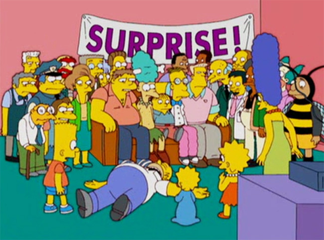 Vários personagens ( • Moe • Kent Brockman • Hans "Toupeira" • Chefe Wiggum • Willie • Nelson • Professora do Bart • Smithers • Mãe do Diretor • Flanders • Barney • Assistente Mel • Ralph • "Dr." Frink • Dr. Hibbert • Rainier Wolfcastle • Carl • Sr. Burns • Dr. Riviera • Cara dos Quadrinhos • Apu • Krusty • Homem Abelha • ) entram na sala escura * só vemos os olhos * - quando os Simpsons chegam a luz acende e eles gritam SURPRESA! Homer se assusta e tem um ataque cardíaco.