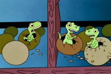 - Em uma das cenas, é possível ver que num dos assoalhos da casa dos Simpsons, entre o quarto de casal e a sala, há ovos e dinossauros eclodindo de dentro deles;
