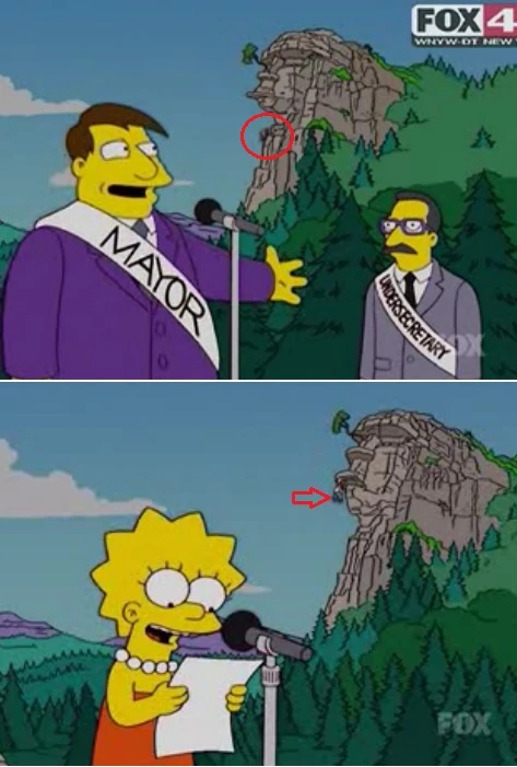 - É possível ver Homer escalando a montanha enquanto o Prefeito Quimby dialogava com a banda que se apresentava no local, continuando enquanto Lisa está no púlpito para iniciar seu discurso, a escalada para arrancar a árvore que está no "olho" do velho de pedra;