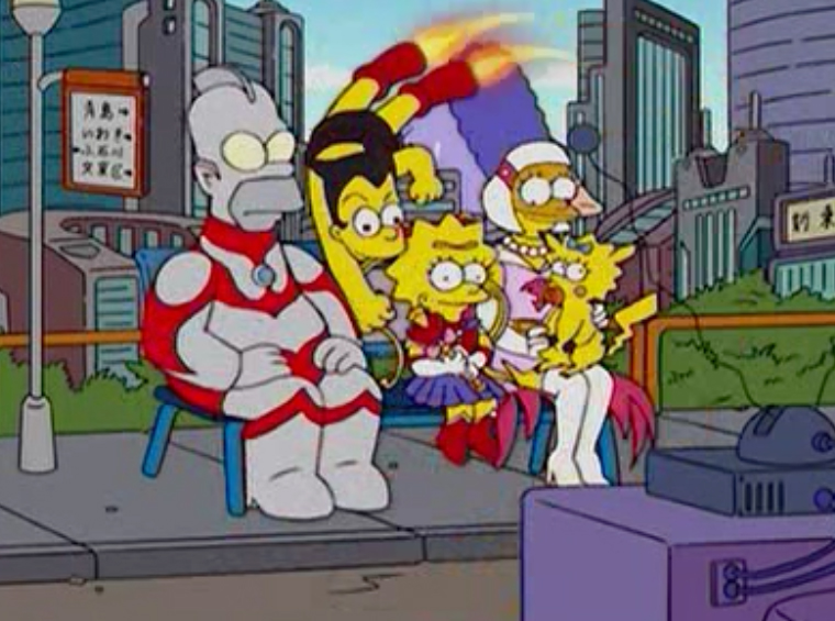 Os Simpsons homenageiam o Japão, fantasiados de famosos personagens de animes; no lugar da sala com o sofá vemos um banco com a escrita "シンプソンズ" ("Simpsons" em japonês) e a TV numa rua, em meio ao que pode ser uma Tóquio futurista. Marge é a Princesa de "G-Force - Defensores do Espaço", Lisa é a Sailor Moon, Homer é o Ultraman, Maggie aparece relampejando de Pikachu e Bart vem voando de Astro Boy. Quando todos estão sentados, o Ultraman (Homer) usa seus poderes para ligar a TV, repetindo a piada do 7º episódio desta mesma temporada.
