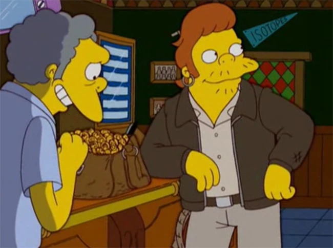 Então, um dia, Snake entra no bar com um saco cheio de moedas de ouro. Snake, que estava mais para um arqueólogo no estilo Indiana Jones e que ainda não tinha entrado numa vida de crimes, queria doar as moedas ao Museu de História Natural de Springfield, mas Moe o engana, dizendo que não poderia doar as moedas naquele momento porque estavam limpando as estátuas (bem debaixo daquele lugar). O então Professor Snake diz que está tudo bem e que irá passar a noite no hotel logo em frente (Hotel Vista do Moe?). Moe, sorrateiramente, vai ao hotel depois e rouba as moedas de Snake - agora ele podia sair de Springfield com sua namorada.