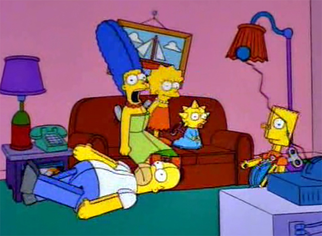 A família chega até a sala na forma de brinquedos movidos à corda; Lisa pula numa perna só, Maggie tem rodinhas, Marge resmunga enquanto anda e as três alcançam o sofá... Já Homer e Bart ficam pelo caminho. (essa piada é repetida no 19º ep. desta mesma temporada)