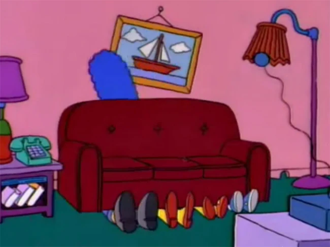 Os Simpsons são o sofá e o sofá é os Simpsons: A família já estão na sala, diante da TV, como se sentados no sofá; então partes do sofá surgem de vários lados e se unem, formando o móvel, que pousa em cima da família. Os Simpsons não suportam o peso do sofá e vão ao chão; detalhe para a chupeta de Maggie "voando" por detrás do sofá.