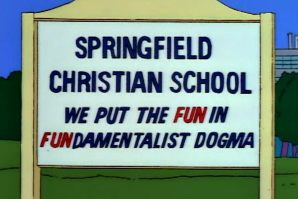 - O cartaz da Escola Cristã de Springfield diz: "We Put the Fun in Fundamentalist Dogma.". Não há tradução adequada para esta piada.