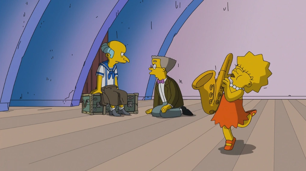 Далее она отговаривает Смиттерса от попытки утащить Бернса со сцены. В результате Бернс вновь оказывается без штанов и напускается на Лизу. Та пытается казать ему на публику. Но оказывается, что все 15 тыс. человек моментально свалили. Чтобы как-то отвлечь Бернса, Лиза пытается сделать "колесо", но у нее вовсе не получается. Глядя на нее Бенрс смягчается. Он говорит, что не может на нее злиться. Он просит ее поиграть на ее "немецкой дудке" (саксофон). Лиза радостно соглашается.