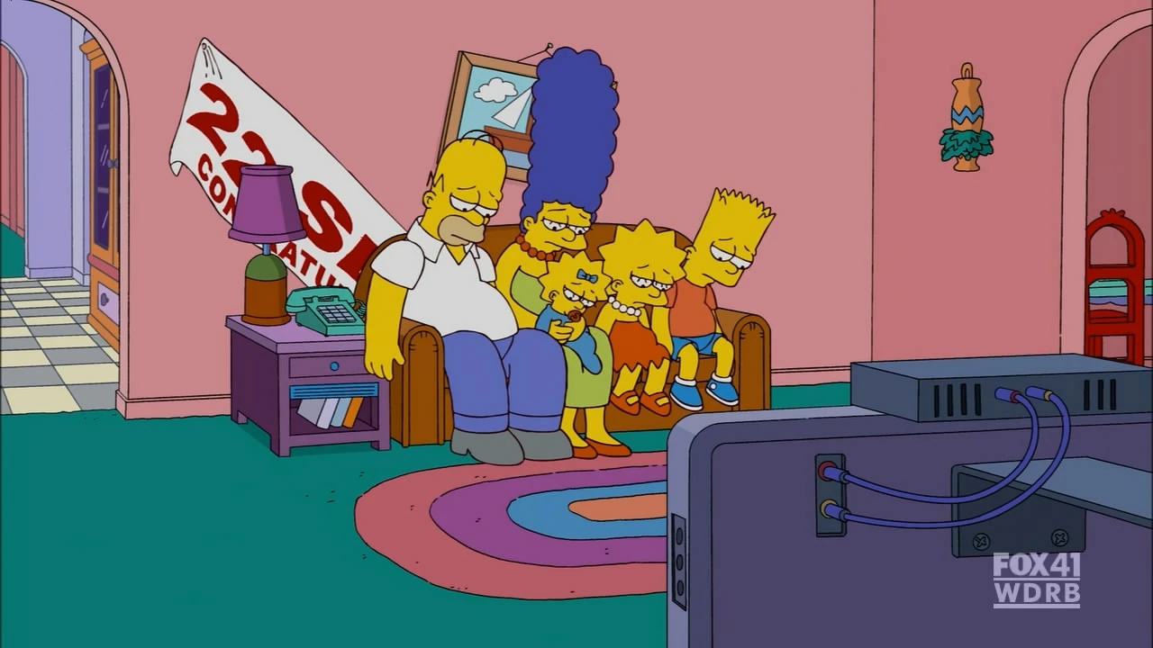 The Simpson family runs in and sits on the couch as usual, but above the couch is a banner hung above the couch that says,"22 Seasons: Congratulations from FOX". A FOX representative comes in with a cupcake that has a candle on it, and Marge lets Maggie to blow the candle, so she blows out the candle. However, before the family can have the cupcake, the FOX representative eats it for himself, then leaves the room. The banner then falls down as the Simpsons turn depressed.