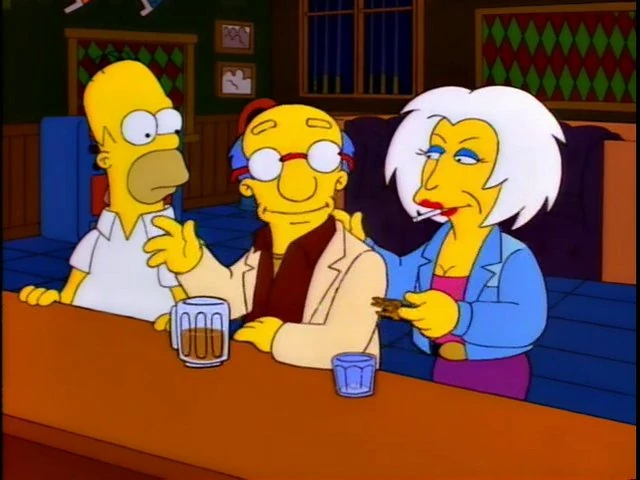 "Homer vs. Patty and Selma": A government clerk smokes in a building (Patty and Selma at the DMV/the county clerk who gives Homer his divorce for eight dollars).