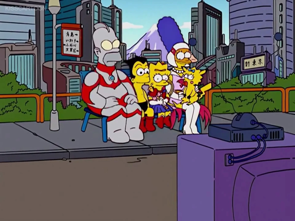 The couch is a street bench in Japan, and everyone is a famous anime character: Homer is Ultraman, Marge is Jun from Science Ninja Team Gatchaman, Lisa is Sailor Moon, Bart is Astro Boy, and Maggie is Pikachu from Pokémon.