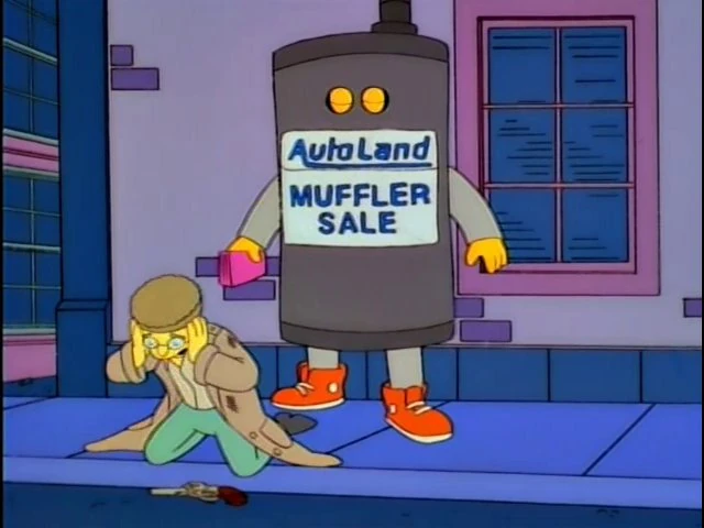 AutoLand is a company that sells car parts. When Waylon Smithers, Jr. was in a depressed state due to Mr. Burns' supposed death, a salesman from the company gave him a pamphlet advertising for its muffler sale.