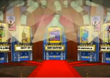 The elevator takes Homer, Bart, Lisa and Marge up to another section of the engine, above the previous one, but this resembles a fancy movie megaplex with a red carpet all over the floor, big stairways on each side that connect to a door with a mansion behind it, tubes transporting money to the mansion, posters of games everywhere and five portals with pictures of the Simpsons, four of which transport to some other worlds and one to Springfield.