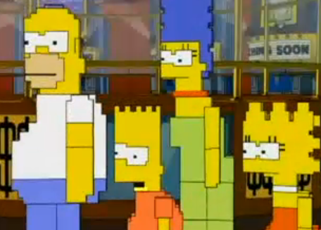 - Pixelated Simpsons: they are the pixelated versions of the real Simpsons and are trapped in the "Escape from Krusty Island" cartridge which is about to be destroyed until real Homer and Bart put the incinerator off. Pixelated Homer likes donuts like real Homer.
