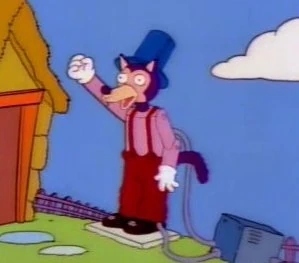 He tries to gobble up the pigs and succeeds in blowing down two of their houses, made of straw and wood. However, he fails to blow down the other pig's house, which is made of brick. The wolf runs away after he burns his tail.