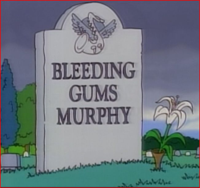 He makes his final appearance in "'Round Springfield". When Bart ends up in the hospital after eating a jagged metal Krusty-O's, Lisa finds Bleeding Gums in a hospital bed in a nearby ward. They play Carole King's "Jazzman" together, entertaining the hospital. He explains about his life, family and work to her as well as giving her advice for her upcoming school performance, lending her his saxophone. When Lisa returns she is devastated when she finds out that Bleeding Gums has died from circumstances that are never revealed, possibly cardiac arrest. [7] Lisa is the only one to attend Murphy's funeral. Reverend Lovejoy gets his name wrong, calling him "Blood and Guts Murphy" and "Bloody Gums Murphy", as well as saying that he was "quite the sousaphone player". This prompts Lisa to buy his album, as the jazz station didn't have it, although she cannot afford it. Bart uses the $500 he got from his court case against "Krusty O's" to buy it for her. She gives it to the jazz station who play it on the radio. The signal isn't strong enough, but a lightning strike boosts the signal so that all of Springfield does hear it.