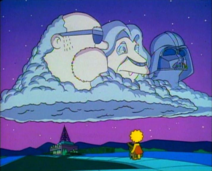 Bleeding Gums (left) appearing to Lisa Simpson in a cloud, after his death in 'Round Springfield.'